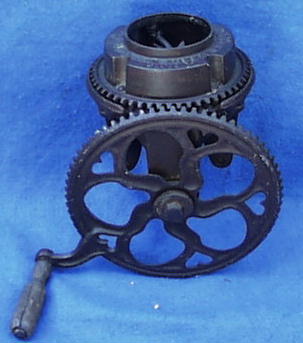 | A hand crank com sheller was kept here. It shelled one ear of com at a time. The handle was cranked at the same time the com was put into the sheller. The com spewed down a chute into a basket while the cobs fell to a pile on the floor. |