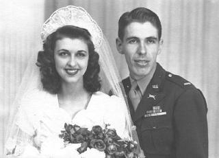 This was November and I wanted a white wedding dress. I couldn't find one in Seneca so I went to all the nearby towns and finally found one in a store in Sabetha. They even had a veil and long white gloves to wear with the dress. I called my friend Mary Alice Luebbe who was in nurse training in Kansas City to be a bridesmaid. She seemed pleased that I had asked her. I told her we didn't have time to get to particular about the bridesmaid dresses on such short notice so any formal she had would do. She borrowed pink formal to wear and it looked very pretty. And so we were married on a beautiful winter day November 3, 1944. Mom kept the phone lines busy and all my aunts, uncles and other relatives were at the mass. Mom had a dinner that noon for everyone. Jean was surprised at how many relatives I had. I was related to almost everyone in that county. Father Matthew said he was glad I was marring someone from out of that area so we'd get some new blood in the town. " "